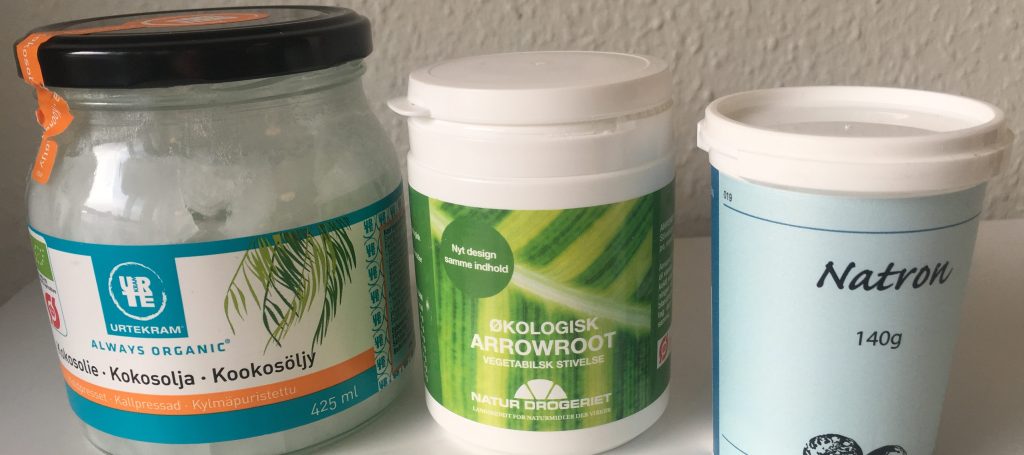 Grundopskriften er den samme. Den består af 2 spsk. kokosolie, 2 spsk. arrowroot pulver og 3 spsk. natron. Faktisk kan du bruge deodoranten kun med grundopskriften, og så får du en udgave, der blot dufter svagt af kokos. Hvis du, ligesom jeg, synes det er rart, at din deodorant dufter en smule, kan du eksperimentere med din egen duftkombination. I så tilfælde, vil jeg anbefale at starte ud med en mindre portion af grundopskriften eller at dele den op i forskellige beholdere og teste duftene i mindre portioner.